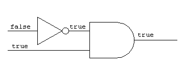 〔プログラムの説明〕 ディジタル論理回路シミュレータを作成するためのクラスとテスト用クラスである。 (1) ゲートを表す抽象クラス Gate のサブクラスとして, NOT ゲートを表すクラス NotGate 及び AND ゲートを表すクラス AndGate を定義する。 (2) Gate のすべてのサブクラスは,メソッド connectOutputTo,getInput 及び getOutput を継承し,メソッド tick を実装する。 (3) メソッド connectOutputTo は,ゲートの出力信号線を, 指定されたゲートの入力信号線に接続する。 (4) メソッド getInput 及び getOutput は,ゲートの入力信号線及び出力信号線を それぞれ返す。 (5) メソッド tick は,各ゲート固有の演算を実行し,出力信号線に true 又は falseのいずれかの値を出力する。 (6) クラス Wire は,入力信号線又は出力信号線を表す。 (7) 各ゲートの出力信号線は,1本とする。 (8) テスト用クラス LogicCircuitTest で作成する回路及び動作の例を,次に示す。 メソッド main は,演算結果の値を標準出力に表示する。