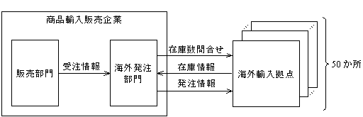 (2) 海外発注部門の輸入割当てシステムは,受注情報のうち商品コードを基に, その商品を扱っている海外輸入拠点に商品コードを送信し,在庫数を問い合わせる。 輸入拠点は世界各地に 50 か所あり,海外発注部門とオンラインで接続されている。 輸入拠点によって取り扱う商品が異なり,同一商品を複数の輸入拠点が取り扱う場合もある。 (3) 輸入拠点は,問合せを受けた商品の在庫情報を,即時に海外発注部門へ返信する。 在庫がない場合は,在庫数を0として返信する。 海外発注部門は,返信された在庫情報をいったん在庫情報ファイルへ書き出す。 在庫情報の様式を次に示す。