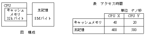 問22 ヒット率の計算図に示す構成で,表に示すようにキャッシュメモリと主記憶のアクセス時間だけが異なり, ほかの条件は同じ2種類の CPU X と Y がある。 あるプログラムを CPU X と Y でそれぞれ実行したところ,両者の処理時間が等しかった。 このとき,キャッシュメモリのヒット率は幾らか。 ここで,CPU 処理以外の影響はないものとする。