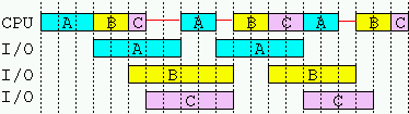 問30 マルチプログラミング三つのタスクの優先度と,各タスクを単独で実行した場合の CPU と入出力装置( I/O )の 動作順序と処理時間は,表のとおりである。 三つのタスクが同時に実行可能状態になってから,すべてのタスクの実行が終了するまでの, CPU の遊休時間は何ミリ秒か。 ここで,I/O は競合せず,OS のオーバヘッドは考慮しないものとする。