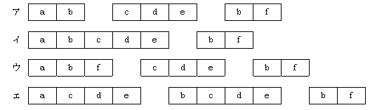 問67 レコードの第3正規形項目 a 〜 f からなるレコードがある。 このレコードの主キーは,項目 a と b を組み合わせたものである。 また,項目 f は項目 b によって特定できる。 このレコードを第3正規形にしたものはどれか。