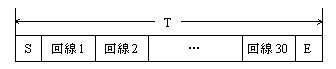 設問2 電話の場合,通話ごとに電話回線を用意していては費用がかかるので, 基幹の伝送路では複数の回線を束ねて伝送する。 このように1本の伝送路上に複数の通信回線を束ねることを多重化という。 ディジタル伝送の多重化方式として,TDM(時分割多重化)方式がある。 これは,各回線に対して,標本化1回分の符号化ビット列を送る時間を順番に割り当てて, 複数回線のディジタル信号をまとめ(フレーム化),1本の伝送路上にフレームを 順番に送り出す方式である。 設問1 の音声伝送に対して,30 回線を TDM 方式によって多重化して伝送するとき, 必要最小限の伝送速度( k ビット/秒)として正しい答えを,解答群の中から選べ。 なお,1 フレームは,30 回線の標本化1回分の符号化ビット列(各8ビット)と, フレーム同期パルス (3) などの 16 ビット (図中の S と E を合わせた部分)で構成される。