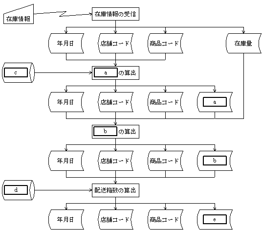 問05 プログラム設計プログラム設計に関する次の記述を読んで,設問1,2に答えよ。 各店舗が毎日の営業時間終了後に本社へ送ってくる商品の在庫情報と, その店舗における過去の販売実績の情報から,商品の補充のための配送情報を 作成するプログラムを設計する。 このプログラムの概要は,次のとおりである。