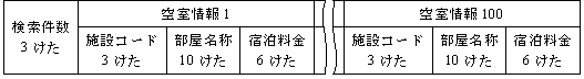 @ 施設コード:3けたの数字である。 “000”のときは施設の指定がないことを表す。 A 宿泊開始日:4けたの西暦年,2けたの月,2けたの日で構成されている。 プログラムを実行する翌日から1年以内の日付とする。 例 2003 年 10 月 20 日ならば“20031020”となる。 B 宿泊日数:2けたの 0 でない数字である。 宿泊開始日から連続して泊まる日数を表す。 連続して泊まる日を含めて,プログラムを実行する翌日から1年間に収まる日数とする。 例 1泊2日のときは,“01”となる。 C 宿泊人数:2 けたの 0 でない数字である。 D 1 泊の予算:1人当たりの1泊の予算であり,下限と上限を示す1組の 6けたの数字である。 下限と上限がともに“000000”のときは指定なしを表す。 例 10,000 〜 15,000 円の部屋を検索するときは, 下限として“010000”,上限として“015000”を指定する。 (4) 検索結果 SEARCH-RESULT の形式は,次のとおりである。