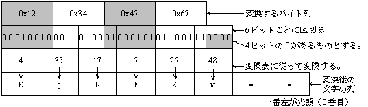 問08 Java次の Java プログラムの説明及びプログラムを読んで,設問に答えよ。 〔プログラムの説明〕 プログラムは,バイナリデータのバイト列をあるアルゴリズムに従って変換し, その結果を文字の列として取得するためのクラス Encoder とそのテスト用クラスからなる。 変換アルゴリズムは次のとおりである。 (1) バイト列の先頭から順に6ビットずつ取り出し,変換表の対応する文字に変換する。 ただし,バイト数が3の倍数でないときは,ビット数が6の倍数になるように, 最後に 4ビット又は2ビットの 0 があるものとする。 (2) 変換後の文字数が,与えられたバイト数の 4/3 倍以上で最も 小さい 4の倍数になるように,文字の列の最後に必要な個数だけ“=”を付加する。 (3) 変換例を図1 に示す。