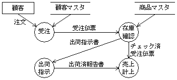 データの発生・吸収・処理・蓄積等のシステムの間を、データの流れを示す矢印で表現する。