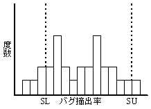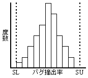 問77 バグ摘出率のヒストグラムある単体テスト工程では,1,000 ステップ当たりのバグ摘出率はほぼ正規分布になることが分かっている。 チーム別のバグ摘出率をヒストグラムで表したところ,バグ摘出率が高いことを嫌って データを意図的に操作し,管理値内に収めてしまったチームがあることが推測できた。 これに該当するヒストグラムはどれか。 ここで,SL は管理下限,SU は管理上限を表す。