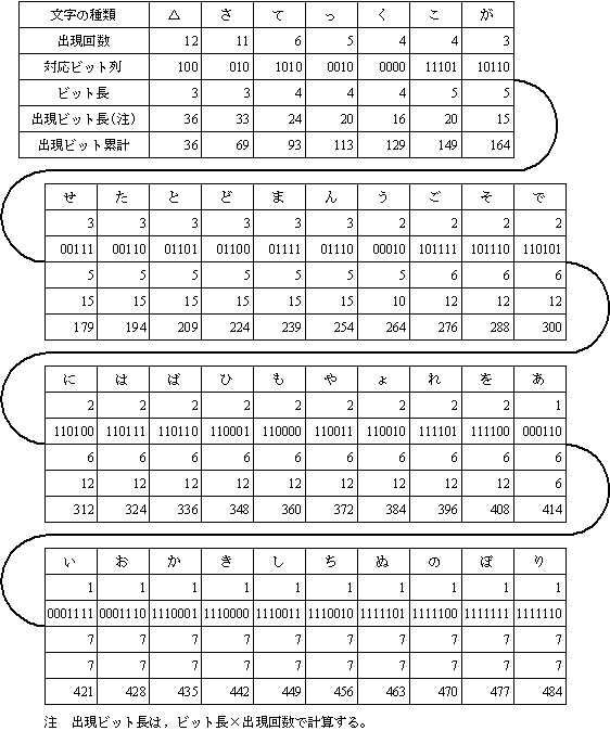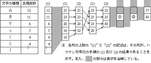 〔ハフマン符号化の手順〕 文字の出現回数の偏りを利用したハフマン符号化を用いれば, この文字列を更に短いビット列で表現することができる。 この文字列をハフマン符号化する手順は,次のとおりである。 (1) 文字列を構成する文字の種類を,その出現回数の多い順に並べ替える。 同じ出現回数の場合は,文字コードの昇順とする。 また,(2) で説明する仮想の文字の場合,出現回数が同じであるときの順序は, 並べ替える直前の順序に従うものとする。 (2) (1) の並べ替えの結果,最下位になった文字とその一つ上位の文字の 2文字をグループ化し,これを仮想の1文字として扱い,最下位に位置付ける。 この仮想の文字の出現回数は,グループ化した2文字の出現回数の和とする。 (3) (2) の結果,すなわち,文字の種類が一つ減った状態のものに対し,(1),(2) を, 文字の種類が2種類になるまで繰り返す。 (4) (3) で,最後に残った2種類の文字のそれぞれに,長さ1のビット列1又は 0 を対応させる。 (5) (4) の2種類の文字から戻りながら各文字にビット列を対応させる。 (i) 1段階戻ったときの2種類の文字に対しては,直前の段階のビット列の右端に 1 又は 0 を付加したビット列をそれぞれ対応させる。 (ii) 元の 37 種類すべての文字にビット列が対応するまで (i) を行う。 (6) この 37 種類のビット列を用いて,対象となる文字列を表現する。 設問2 次の記述中の