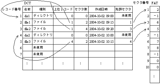 図2 DCT と FAT の関係の例 (5) ファイル及びディレクトリの生成と削除操作の内部処理は,表3のとおりである。 ただし,同一ディレクトリの直下には,同じ名前のファイル又はディレクトリは作成できない。