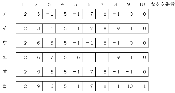 図1 ディレクトリ構造の例 このシステムでは,ファイルアロケーションテーブル( FAT )と ディレクトリ管理テーブル( DCT )の二つのテーブルによって, ファイル及びディレクトリの情報を管理している。 (1) ディスクは,セクタと呼ばれる一定の大きさの領域に区切られる。 セクタには,1から始まるセクタ番号が順に付けられている。 ファイルは,1個以上のセクタに分割して格納される。 (2) FAT は,セクタの状態を管理するための整数型の1次元配列であり, セクタの状態に応じて,表1に示す値が格納されている。