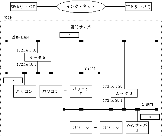 X 社では,社外とのネットワーク接続にインターネットを利用している。 社内の各部門ごとに LAN があり,複数のパソコンやサーバを接続する。 パソコンやサーバには固定のプライベート IP アドレスを付与する。 各部門の LAN は,ルータを介して基幹 LAN に接続する。 インターネットへの接続は,基幹 LAN 上の関門サーバが行う。 関門サーバには,プロキシの機能,コンピュータウイルスを検出する機能, ファイアウォールの機能などが含まれている。 X 社のネットワーク構成を,Y 部門と Z 部門を例にとって図に示す。 図中の数字は,IP アドレスを表す。