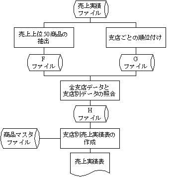 支店別の売上実績表を作成する方法について,図2に示す処理の流れ図を作成した。 〔売上上位 50 商品の抽出〕 商品コードをキーとして売上実績ファイルを整列する。 商品コードごとの販売数量の合計と売上金額の合計とを計算し, 売上金額の多い順に上位 50 商品を F ファイルに出力する。 〔支店ごとの順位付け〕 支店コード,売上金額(降順)をキーとして売上実績ファイルを整列する。 支店ごとに売上金額の多い順に支店データの順位を付け,G ファイルに出力する。 〔全支店データと支店別データの照合〕 全支店データ( F ファイル)をメモリに格納した後,支店別データ( G ファイル)と照合して, 1レコードに編集した次の様式の H ファイルを作成する。 H ファイルのレコード様式