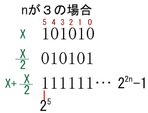 問02 2進数ある自然数 x を2進数で表現すると,1 と 0 が交互に 並んだ 2 n けたの2進数 1010…10 となった。 このとき, x に関して成立する式はどれか。 = 22n
