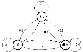 次の図は,ある地方の日単位の天気の移り変わりを示したものであり, 数値は翌日の天気の変化の確率を表している。 ある日の天気が雨のとき,2日後の天気が晴れになる確率は幾らか。