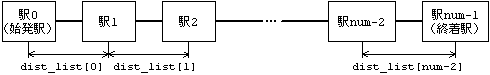 図1 引数 num と dist_list の関係 (2) 距離から運賃を求めるために,関数 calc_fare を用いる。 dist 2駅間の距離(km)