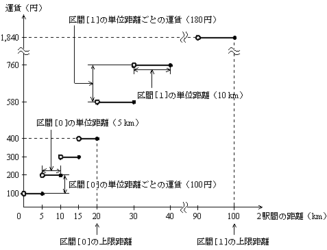 (3) 2駅間を幾つかの区間に分け,区間ごとに計算した運賃を合計したものを, 2 駅間の運賃とする。 (4) 各区間の運賃は,次の @ 〜 C のとおりである(図2参照)。 @ 最初の 20 km 以下の区間(区間[0])の運賃は,5 km 増えるごとに 100 円加算する。 A 20 km を超え 100 km 以下の区間(区間[1])の運賃は,10 km 増えるごとに 180 円加算する。 B 100 km を超え 500 km 以下の区間(区間[2])の運賃は,50 km 増えるごとに 850 円加算する。 C 500 km を超える区間(区間[3])の運賃は,100 km 増えるごとに 1,650 円加算する。