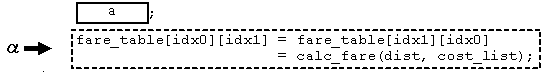 〔プログラムの説明〕 関数 make_fare_table は,ある鉄道路線における始発駅から終着駅までの隣接駅間の 距離から,その鉄道路線上の全駅間の運賃を求め,運賃表を作成するプログラムである。 (1) 関数 make_fare_table の引数は,次のとおりである。 num 始発駅から終着駅までの駅数