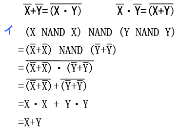 問09 NANDを使って表した論理式X と Y の否定論理積 X NAND Y は, NOT ( X AND Y )として定義される。 X OR Y を NAND だけを使って表した論理式はどれか。 イ ( X NAND X ) NAND ( Y NAND Y ) ウ ( X NAND Y ) NAND ( X NAND Y ) エ X NAND ( Y NAND ( X NAND Y ))