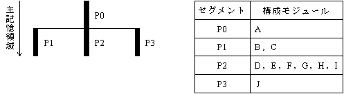 図2 モジュールの実行順序 (3) A 〜 J の各モジュールの実行に必要な主記憶領域の大きさは,表のとおりである。 なお,セグメントの大きさは,セグメントを構成するモジュールの大きさを合計したものになる。 表 モジュールの大きさ