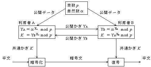 このとき,共通かぎ K の値は, また,DH 法は,通信経路上の第三者 C が,利用者 A から送られる情報を,