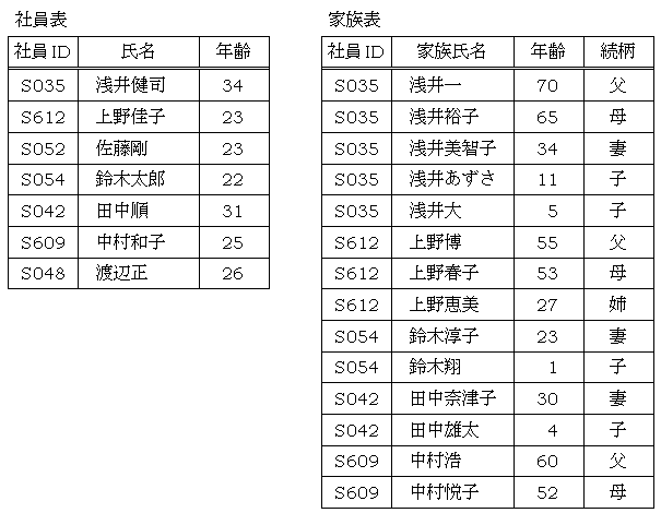 問01 関係データベースに関する記述関係データベースに関する次の記述を読んで,設問1,2に答えよ。 ある会社には,次の社員表,家族表からなる関係データベースがある。 ![]()