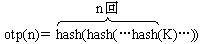 〔ログイン管理システムの説明〕 サーバへのログイン可能回数 M と定数 K を決定し,M 個の有効な使い捨てパスワードを使用する。 残りのログイン可能回数が n のときの使い捨てパスワード。 otp(n) には,一方向性関数 hash を用いて,次式で得られる値を用いる。