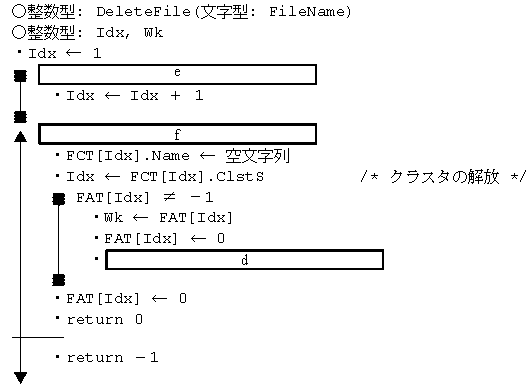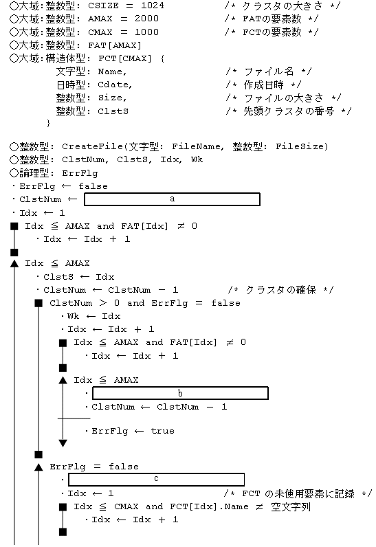 a に関する解答群 ア FileSize ÷ CSIZE イ FileSize ÷ CSIZE + 1 ウ FileSize ÷ CSIZE − 1 エ (FileSize + CSIZE + 1) ÷ CSIZE オ (FileSize + CSIZE − 1) ÷ CSIZE b 〜 d に関する解答群 ア FAT[Idx] ← Idx イ FAT[Idx] ← Wk ウ FAT[Idx] ← −1 エ FAT[Wk] ← Idx オ FAT[Wk] ← Wk カ FAT[Wk] ← −1 キ Idx ← FAT[Idx] ク Idx ← FAT[Wk] ケ Idx ← Wk