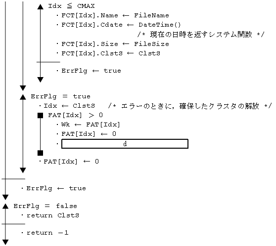 (7) 関数 CreateFile がファイルの領域を確保する手順は,次のとおりである。 @ FAT 内を先頭から順番に調べて, 引数で指定されたファイルが格納できる必要最小限の個数のクラスタを確保する。 A FCT 内を先頭から順番に調べて,未使用要素(メンバ Name の内容が空文字列)に情報を記録する。 B FAT 内で必要なクラスタが確保できない場合や,FCT 内に未使用要素がない場合はエラーとする。 (8) 関数 CreateFile の引数と返却値の仕様を次に示す。