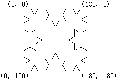 @ 始点の座標を(x1,y1),終点を(x2,y2)とする 2 点を結ぶ線分を引く。 A 線分を 3 等分し,中央の線分を一辺とする正三角形を始点から終点に向かって左側に作り, その頂点座標を求める。 始点(x1,y1)から,正三角形の 3 頂点 (x3,y3),(x4,y4),(x5,y5),そして終点(x2,y2)を順番に結んだ四つの線分を引く。 B 得られた四つの線分それぞれを @ の線分とみなし,A の操作を行う。 この操作を繰り返して得られるのがコッホ曲線である。 (2) 関数 DrawLine は,引数で指定された 2 点を結ぶ線分を描画する関数であり,既に用意されている。 関数の仕様は,次のとおりである。 呼出し形式: void DrawLine( int x1, int y1, int x2, int y2 ); 引数: x1 及び y1 線分の始点座標(x1,y1) x2 及び y2 線分の終点座標(x2,y2) 返却値: なし (3) 関数 KochCurve は,引数で指定された 2 点(始点及び終点)の座標を 基点にしてコッホ曲線を描画する関数であり,仕様は次のとおりである。 呼出し形式: void KochCurve( int x1, int y1, int x2, int y2, int dim ); 引数: x1 及び y1 コッホ曲線の始点座標(x1,y1) x2 及び y2 コッホ曲線の終点座標(x2,y2) dim (1) の説明での繰返し回数 0 のとき図1の @ が描画される。 返却値: なし (4) このプログラムを実行すると,図1の A に示すような図形が描画される。 また,行番号 25 を次のとおりに変更して実行すると,B に示すような図形が描画される。 25 KochCurve( 0, 180, 180, 180, 2 ); なお,座標軸は,原点(0,0)から,右向きを x 軸の正方向,下向きを y 軸の正方向とする。