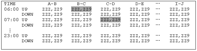 @ TIME は,印字された時間帯の利用であることを表す。例えば,07 時 00 分〜 07 時 59 分における利用ならば,07:00 の行に集計される。 A A-B から I-J の各列は区間を表す。 例えば,A-B は A 駅から B 駅までの区間を表す。 B UP は上り(A 駅から J 駅の方向)を,DOWN は下り( J 駅から A 駅の方向)を表す。 C 利用者数は,入場時刻を基にした経過時間及び乗車区間で集計する。 なお,各駅間の区間所要時間は 10 分とし,待ち時間や乗換えなどは考慮しない。 例えば,(1) の例の“ 6 時 55 分に B 駅から入場し,D 駅で出場した場合”であれば, 次の網掛け部分を 1 名が利用したとみなし,各要素にカウントする。 人数は 999,999 以下とする。