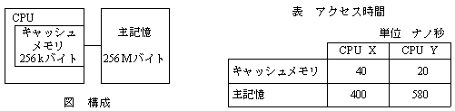 問20 キャッシュメモリのヒット率図に示す構成で,表に示すようにキャッシュメモリと主記憶のアクセス時間だけが異なり, ほかの条件は同じ2種類の CPU X と Y がある。 あるプログラムを CPU X と Y でそれぞれ実行したところ,両者の処理時間が等しかった。 このとき,キャッシュメモリのヒット率は幾らか。 ここで,CPU 処理以外の影響はないものとする。
