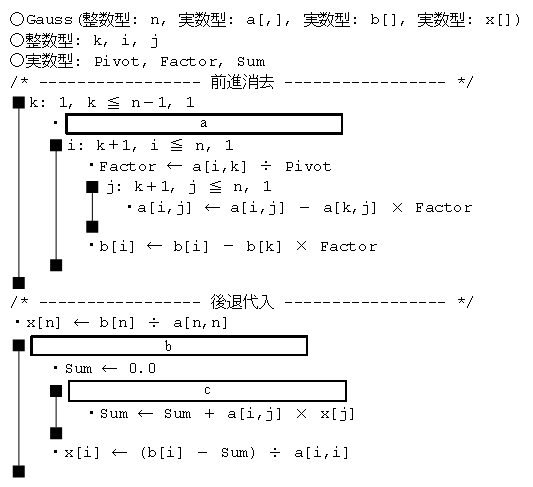 〔プログラムの説明〕 次の n 元連立1次方程式の解,すなわち xi ( i = 1,2,…, n ) の値を求める副プログラム Gauss である。