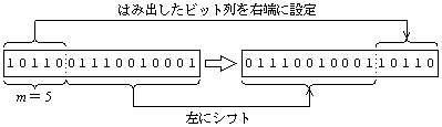 @ GR1 〜 GR4 にはそれぞれ次の内容を設定して,主プログラムから渡される。 GR1:ビット列 A を格納している語のアドレス GR2:ビット列 B(左詰めで設定され,残りのビットには0が設定されている。) GR3:ビット列 C(左詰めで設定され,残りのビットには0が設定されている。) GR4: n ( 1 ≦ n ≦ 16) A ビット列Aの中にビット列 B に一致する部分ビット列が複数個あれば, それらのすべてをビット列 C に置き換える。 B ビット列 A の左端から検索する。 ビット列 B に一致する部分ビット列をビット列 C に置き換えた場合, その部分ビット列の右隣のビットから検索を続ける。 C 副プログラムから戻るとき,汎用レジスタ GR1 〜 GR7 の内容は元に戻す。 (2) 副プログラム ROTSL は,16 ビットからなるビット列を m ビットだけ左に 循環シフトするプログラムである。 例: