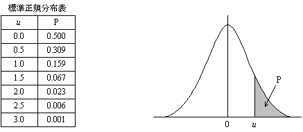 問08 不合格品の割合ある工場で大量に生産されている製品の重量の分布は,平均が 5.2 kg, 標準偏差が 0.1 kg の正規分布であった。 5.0 kg 未満の製品は,社内検査で不合格とされる。 生産された製品の不合格品の割合は約何%か。 ![]()