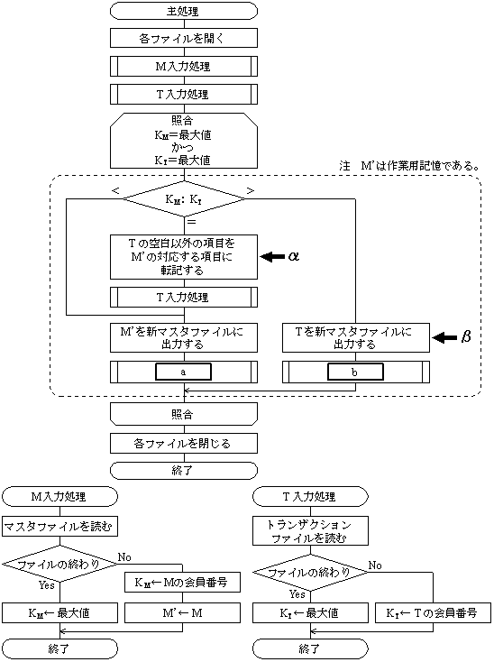 〔処理の説明〕 マスタファイルのレコードを M,トランザクションファイルのレコードを T として,次のキー突合せ処理を行う。 (1) M と同一の会員番号をもつ T があるとき,T の空白以外の項目で M の対応する項目を更新し, T の空白の項目に対応したMの項目は更新せずに新マスタファイルに出力する。 (2) M と同一の会員番号をもつ T がないとき,M をそのまま新マスタファイルに出力する。 (3) T と同一の会員番号をもつ M がないとき,T を新マスタファイルに出力する。 更新プログラムの流れを図1に示す。 突合せキー KM 及び KT には,それぞれ, M の会員番号の値及び T の会員番号の値,又はそれぞれのファイルを読み終わったことを 表す最大値 99999 を格納する。