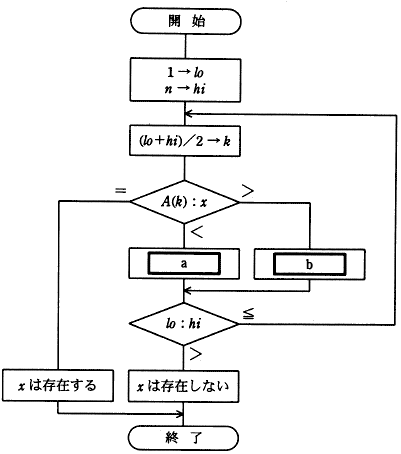 問14 2分探索法昇順に整列された n 個のデータが格納されている配列 A がある。流れ図は, 2分探索法を用いて配列 A からデータ x を探し出す処理を表している。 a, b に入る操作の正しい組合せはどれか。ここで,除算の結果は小数点以下が切り捨てられる。