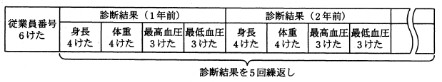 @ 従業員1人に対して1レコードとする。従業員番号が重複することはない。 (2) 今年度の診断結果は,次のレコード様式の順ファイルであり,すべての従業員の 情報が順不同で記録されている。同じ従業員番号のレコードが重複して存在することはない。