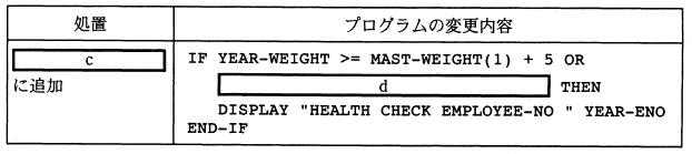 ![]() c に関する解答群 ウ 行番号 37 と 38 の間 エ 行番号 39 と 40 の間 d に関する解答群 イ MAST-WEIGHT(1) >= MAST-WEIGHT(2) - 5 ウ YEAR-WEIGHT <= MAST-WEIGHT(1) - 5 エ YEAR-WEIGHT >= MAST-WEIGHT(1) - 5