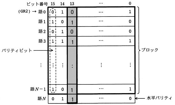 図 パリティビットと水平パリティ (2) 主プログラムは,ブロックの語数 N を GR1 に,ブロックの開始アドレスを GR2に設定し,ブロックの各語のパリティビットに0を格納して副プログラム SETPAR を呼ぶ。 (3) 副プログラムから戻るとき,汎用レジスタ GR1 〜 GR7 の内容は元に戻す。