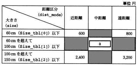 問10 C言語次の C プログラムの説明及びプログラムを読んで,設問1,2に答えよ。 〔プログラムの説明〕 関数 calc_carriage は,直方体の配送物の配送種別及び配送料金を求めるプログラムである。