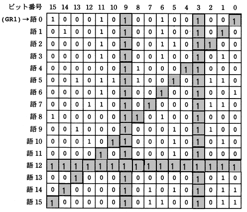 ![]() 図 ビットの配列例 (1) 語0のアドレスが GR1 に設定されて,主プログラムから渡される。 (2) 本数を数えた結果は GR0 に設定して,主プログラムに返す。 (3) 行番号 21 で呼び出される副プログラム SETGR0 は,副プログラム BTEST から 渡された GR0, GR2, GR3, GR4 の内容を基に,列及び対角線の本数を加えた結果を GR0 に設定する。 (4) 副プログラム BTEST から戻るとき,汎用レジスタ GR1 〜 GR7 の内容は元に戻す。 〔プログラム1〕 (行番号) 1 BTEST START 2 RPUSH 3 LD GR0,=0 4 LD GR2,=#0001 ; 左下がり対角線の検査用ビット 5 LD GR3,=#8000 ; 右下がり対角線の検査用ビット 6 LD GR4,=#FFFF ; 列の検査用ビット 7 LD GR5,=16 ; ループカウント 8 LOOP1 LD GR6,0,GR1 9 AND GR2,GR6 ; GR6 中で検査用ビットに 10 AND GR3,GR6 ; 対応するビットが0であれば 11 AND GR4,GR6 ; 検査用ビットを0にする。 12 CPL GR6,=#FFFF ; 行のビットはすべて1か? 13設問1 プログラム1中の