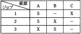 問59 演算効率に関する問題表は,ジョブ1〜3が資源 A 〜 C にかけるロックの種別を表す。 また,資源へのロックはジョブの起動と同時にかけられる。 ジョブ1〜3のうち二つのジョブをほぼ同時に起動した場合の動きについて,適切な記述はどれか。 ここで,表中の“−”はロックなし,“S”は共有ロック,“X”は占有ロックを示す。 ![]() イ ジョブ2の後にジョブ1を起動したとき,ジョブ1の資源待ちはない。 ウ ジョブ2の後にジョブ3を起動したとき,ジョブ3の資源待ちはない。 エ ジョブ3の後にジョブ1を起動したとき,ジョブ1の資源待ちはない。