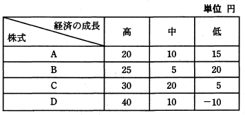 問77 マクシミン原理に従うときの投資いずれも時価 100 円の株式A〜Dのうち,一つの株式に投資したい。経済の成長を 高,中,低の三つに区分したときのそれぞれの株式の予想値上がり幅は,表のとおりである。 マクシミン原理に従うとき,どの株式に投資することになるか。