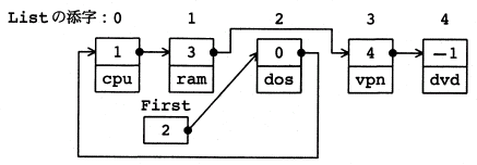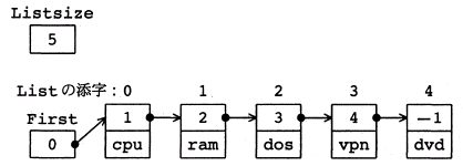 (3) 副プログラム MakeList は,1回の呼出しで,引数の文字列を値とする要素を作成し, リストの最後に追加する。MakeList は探索対象のリストが完成するまで 続けて呼び出される。整数型の大域変数 Listsize には,作成したリストの要素数を 格納する。リストの要素は,List[0] から,List[Listsize-1] に格納する。 リストに登録する要素の個数は,配列の大きさ以下とする。また, リストの先頭の要素が格納されている配列 List の添字は, 整数型の大域変数 First に格納する。First の初期値は−1とする。 リストが空の状態から,MakeList の引数として,'cpu','ram','dos','vpn','dvd' を 順に与えて作成したリストの例を図1に示す。