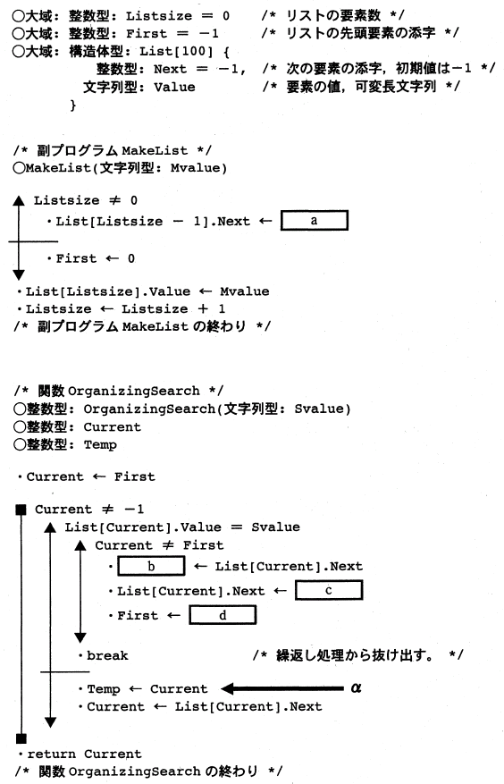 設問1 プログラム中の a に関する解答群 エ Listsize オ Listsize+1 カ Listsize−1