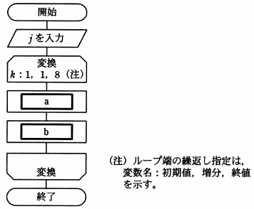 問01 10進整数を2進数に変換する流れ図次の流れ図は,10 進整数 j (0 < j < 100 )を8けたの2進数に 変換する処理を表している。2進数は下位けたから順に, 配列の要素 NISHIN (1) から NISHIN (8) に格納される。 流れ図の a 及び b に入る処理はどれか。 ここで, j div 2は j を2で割った商の整数部分を, j mod 2は j を2で割った余りを表す。