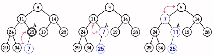 問12 ヒープ親の節の値が子の節の値より小さいヒープがある。このヒープへの挿入は,要素を 最後部に追加し,その要素が親よりも小さい間,親と子を交換することを繰り返せばよい。 次のヒープの * の位置に要素7を追加したとき,A の位置に来る要素はどれか。 ![]() 解説