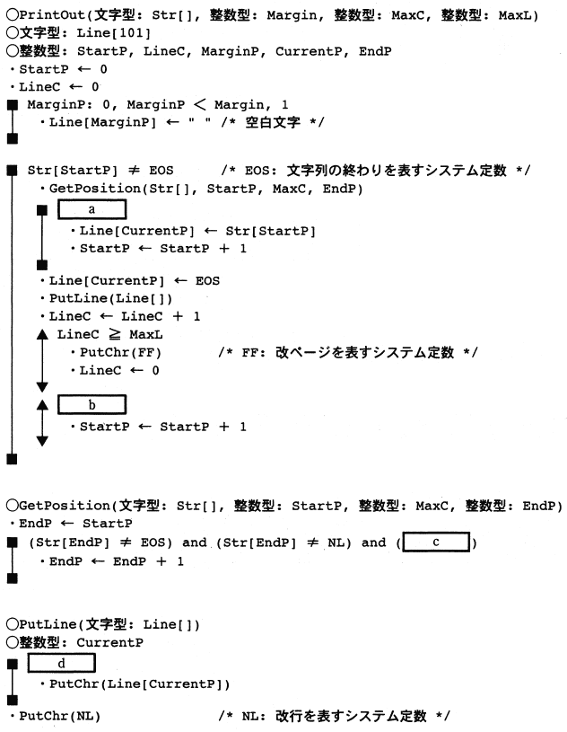 設問 プログラム中の a に関する解答群 イ CurrentP: 0, StartP < EndP, 1 ウ CurrentP: Margin, CurrentP < MaxC, 1 エ CurrentP: Margin, StartP < EndP, 1 b に関する解答群 ウ Str[StartP] ≠ EOS エ Str[StartP] ≠ NL c に関する解答群 ウ StartP < (EndP + MaxC) エ StartP < MaxC d に関する解答群 イ CurrentP: 0, Line[CurrentP] = NL, 1 ウ CurrentP: 0, Line[CurrentP] ≠ EOS , 1 エ CurrentP: 0, Line[CurrentP] ≠ NL, 1