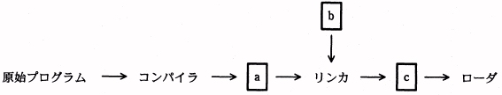 図はプログラムを翻訳して実行するまでの流れを示したものである。コンパイラ, リンカ,ローダの入出力の組合せとして,適切なものはどれか。