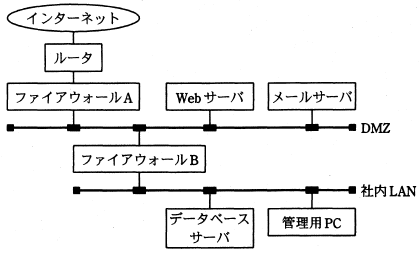 問04 5問選択パケットフィルタリングに関する次の記述を読んで,設問1,2に答えよ。 X 社では,図に示すネットワークを構築し,インターネットへの Web サイトの公開と 電子メール(以下,メールという)の送受信を行っている。 ![]() 図 X 社のネットワーク構成 X 社のネットワークは二つのファイアウォールによって,DMZ 及び社内 LAN の二つの セグメントに分けられている。Web サーバ,メールサーバ及び データベースサーバ(以下,DB サーバという)は,それぞれ次の役割を果たしている。 (1) Web サーバ Web サイトとして,自社の情報をインターネットに公開する。Web サーバ上では, 社外との取引情報を処理するプログラムが動作する。このプログラムが 利用するデータは DB サーバ上に格納される。 (2) メールサーバ 社外とのメールの送受信を行う。また,取引先に対してメールを自動配信するプログラムが動作する。 メール配信のためのデータは DB サーバ上に格納される。 (3) DB サーバ Web サーバ及びメールサーバで利用するデータを格納する。 社内 LAN に接続された管理用 PC からは,SSH を使った各サーバへのログイン操作と, メールサーバを介した外部とのメール送受信が可能である。 管理用 PC から自社 Web サーバの参照はできるが,社外 Web サイトの利用は許可されていない。 ネットワーク上で使われるプロトコルとポート番号を表1に示す。